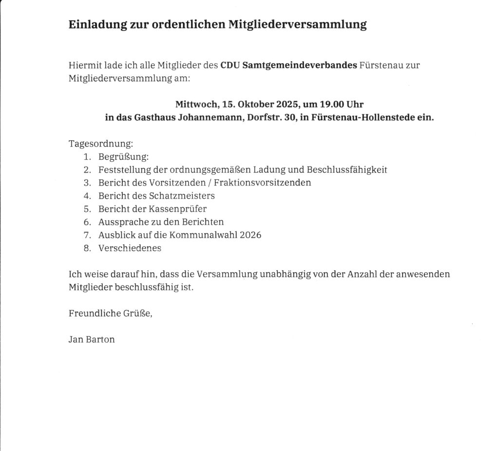 Die Mitgliederversammlung wird aus besonderem Anlass kurzfristig abgesagt. Ein neuer Termin wird rechtzeitig bekannt gegeben. Dort wird sich dann der Bewerber für das Amt des Samtgemeindebürgermeisters vorstellen!
